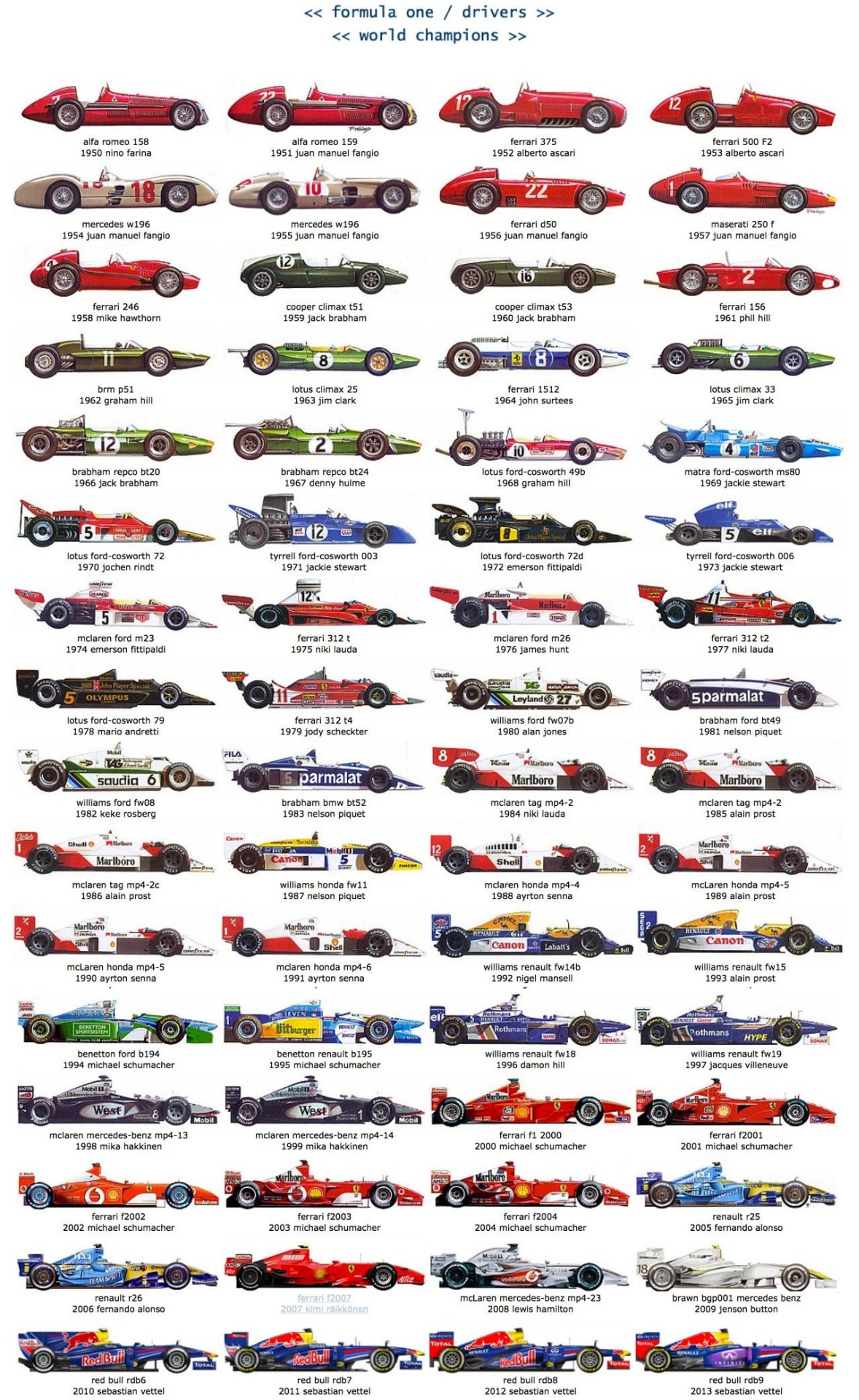 Az 1950-es Formula-1 világbajnokságot az olasz Giuseppe Farina nyerte meg az Alfa Romeóval, míg argentin csapattársa, Juan Manuel Fangio második lett. Fangio nyerte meg a világbajnoki címet 1951-ben, 1954-ben, 1955-ben, 1956-ban és 1957-ben. Bár az angol Stirling Moss egyszer sem lett világbajnok, mégis az egyik legjobb Formula-1-es versenyzőnek tartják a nem világbajnokok közül. Fangio uralta a Formula-1 első évtizedét, és öt világbajnoki címével hosszú időig a sportág legsikeresebb versenyzője volt. Eredményes versenyző volt még mellette Alberto Ascari, aki a Ferrarival megnyerte az 1952. és az 1953. évi bajnokságot. Az utolsó kettő szezonban az angol Mike Hawthorn, majd az ausztrál Jack Brabham nyert. Az évtizedet a gyári csapatok uralták, mint az Alfa Romeo, a Ferrari, a Mercedes és a Maserati, ugyanazok, akik már a háború előtt is versenyeztek. 1958-ban írták ki először a konstruktőri világbajnokságot, amit a Vanwall nyert meg. Az első években a háború előtt épített autókat használták. Az autók keskeny, mintázott gumiabroncsokkal voltak felszerelve. Az 1950-es években a Formula-1-es naptár néhány európai nagydíjból és az amerikai 500 mérföldes versenyből állt, amelyet az Indianapolis Motor Speedwayen rendeztek meg. Az Alfa Romeo visszavonulása után a világbajnokságot a 2 literes, sűrítő nélküli motorral felszerelt kocsiknak rendezték. Ezután bevezették a 2,5 literes, sűrítő nélküli autókat, ami miatt visszatért a Mercedes. A több újításának köszönhetően a Mercedes autóival két éven keresztül nyertek bajnokságot versenyzői, ám a csapat a Le Mans-i tragédia miatt kiszállt a motorsportból.